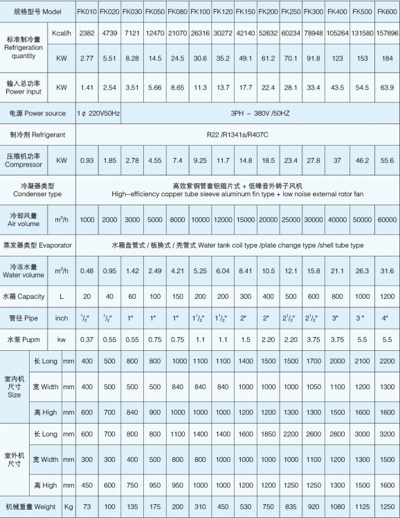 FK 系列分體式風(fēng)冷工業(yè)冷水機(jī),含室內(nèi)機(jī)和室外機(jī)兩部分。該冷水機(jī)壓縮機(jī)、冷凝器、風(fēng)扇安裝在室外,因此熱量盡可能排于室外,且室內(nèi)機(jī)體積小、噪聲低。壓縮機(jī)、水泵、溫控表、壓力控制等關(guān)鍵部件優(yōu)選使用進(jìn)口品牌產(chǎn)品,可靠性高。蒸發(fā)器采用不銹鋼盤管或不銹鋼板換制成,耐腐蝕、抗凍。廣泛用于掃描電鏡、原子吸收、ICP、激光器、真空鍍模機(jī)、離子刻蝕機(jī)、氧氮分析儀、透射電鏡、衍射儀、勞光光譜儀、離子束外延、分子束外延等分析儀器以及大功率X 射線衍射儀、疲勞試驗(yàn)機(jī)、大型釬焊爐、大型真空焊接等設(shè)備中。同時(shí)在醫(yī)療儀器、機(jī)床設(shè)備和液壓系統(tǒng)中也得到了廣泛運(yùn)用。