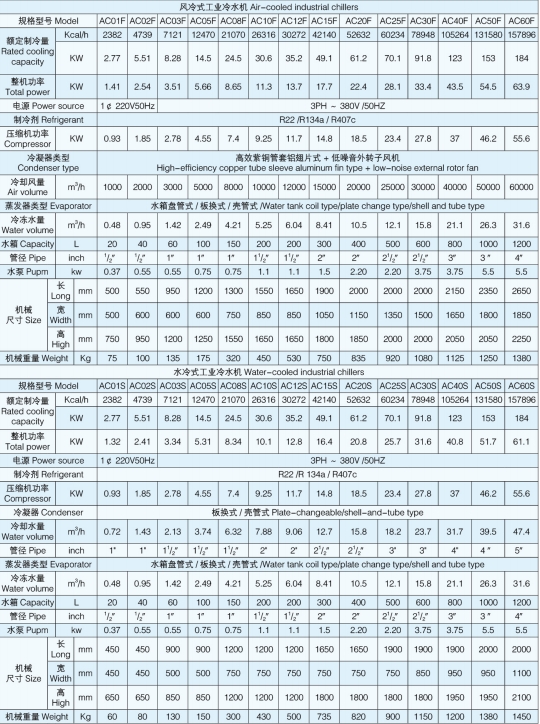 AC系列工業(yè)冷水機(jī)具有體積小、安裝使用方便、在室內(nèi)可任意移動等特點。壓縮機(jī)、水泵、溫控表、壓力控制等優(yōu)選使用全球知名品牌產(chǎn)品,可靠性高,噪聲低。蒸發(fā)器采用純鈦金屬或不銹鋼材質(zhì)制成,耐腐蝕、抗凍、這類機(jī)型被廣泛地用于掃描電鏡、原子吸收、ICP、激光器、真空鍍模機(jī)、離子刻蝕機(jī)、氧氮分析儀、衍射儀、熒光光譜儀等科學(xué)儀器中,以及電子制造、焊接機(jī)器人、氦氣壓縮機(jī)、真空爐、反應(yīng)釜、醫(yī)藥化工、食品飲料、 超聲波、印刷醫(yī)療儀器、機(jī)床設(shè)備及液壓系統(tǒng)等等各種工業(yè)冷卻領(lǐng)域中。